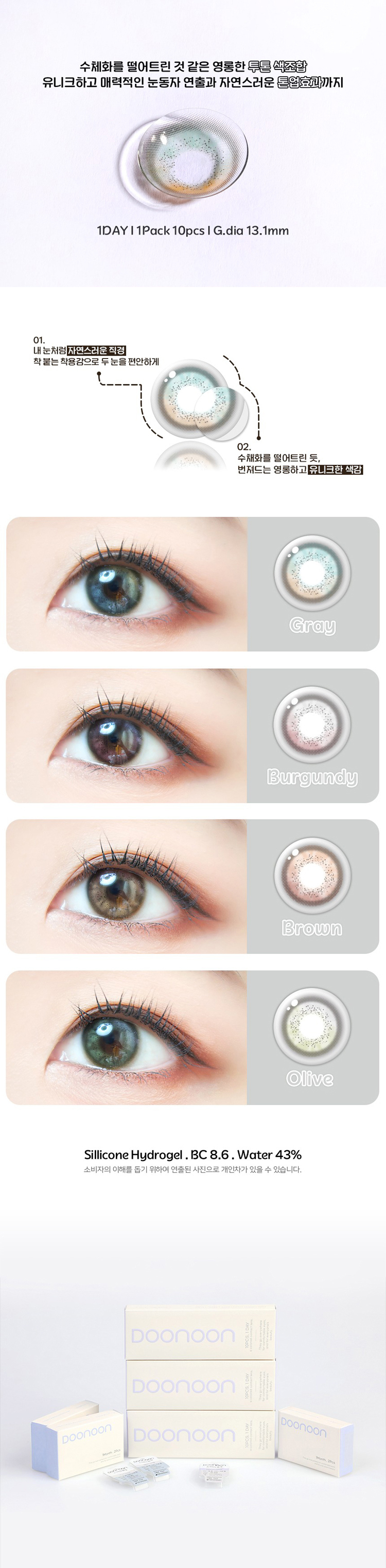 「Doonoon Shell 1 Day 日拋美瞳,以『貝殼』內部的柔和光暈為靈感,推出灰、棕、橄欖、勃根地四色。主打自然輕透、彷彿天生的原生感眼神,邊界模糊設計打造零妝感『微美瞳』效果。韓國直送。」
