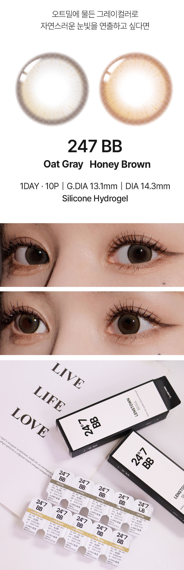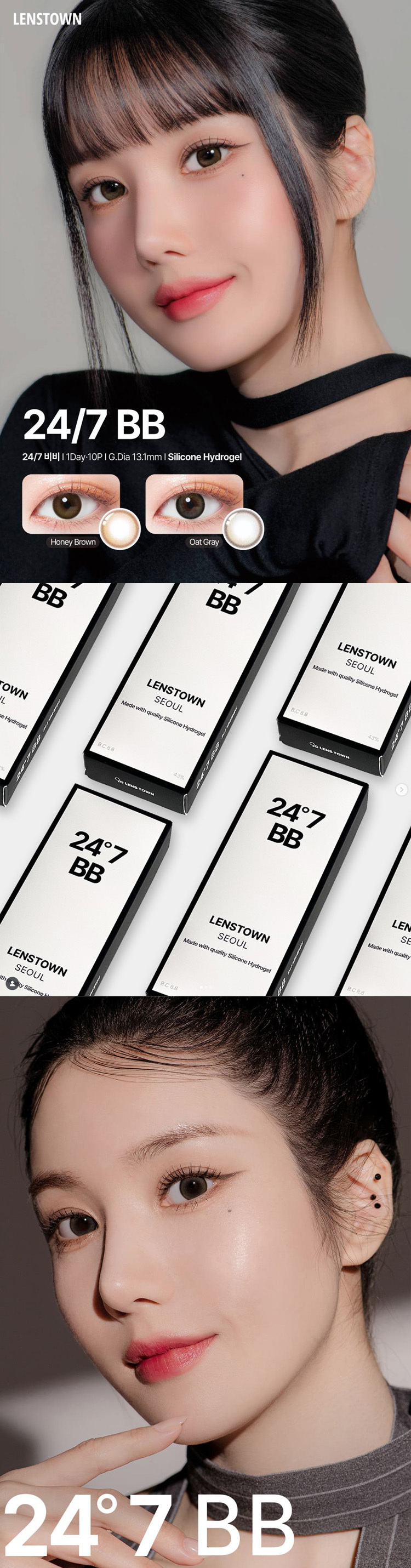 『Lenstown 247 BB』是品牌對『自然美瞳』的終極詮釋。輕薄、修飾、宛若天生。這個系列不只追求『透明感』,更追求『修飾感』,能像柔焦鏡頭一樣,均勻你的瞳色、掩蓋渾濁,呈現出彷彿經過精心休養後的健康、清澈瞳孔,同時承襲了『247』系列引以為傲的長效舒適科技。