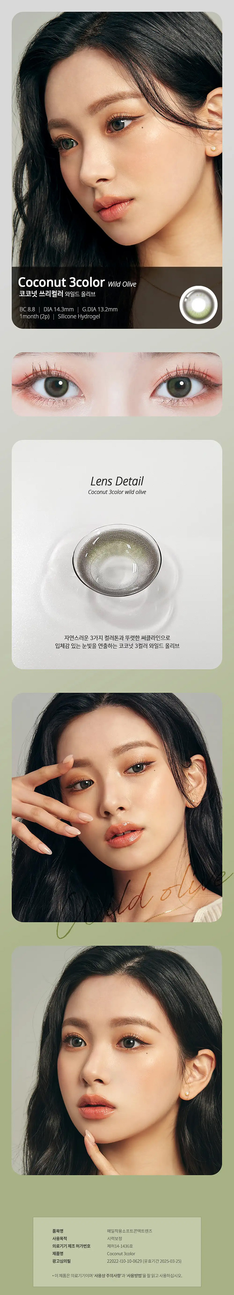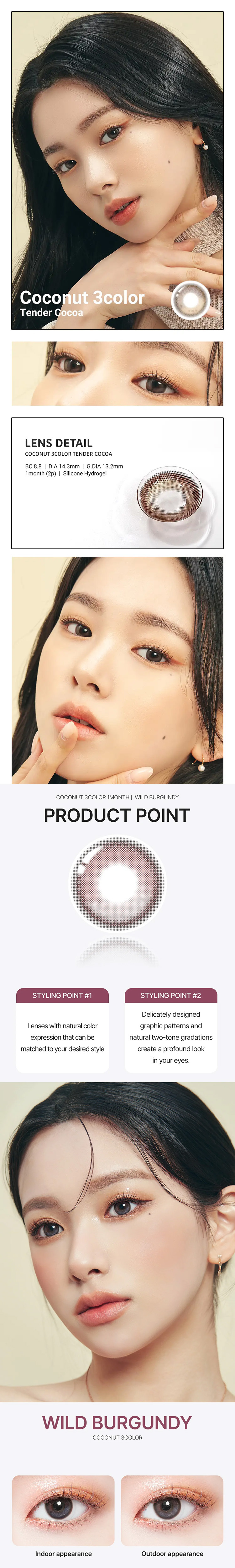 覺得一般美瞳顏色單一、不夠立體嗎?Coconut 3Color 的『三色漸層』技術能解決你的煩惱!三種和諧的椰奶色系層層疊加,讓你的雙眼看起來深邃又有神,自帶溫柔光環,特別適合打造韓系溫柔妝容與日常混血妝感。