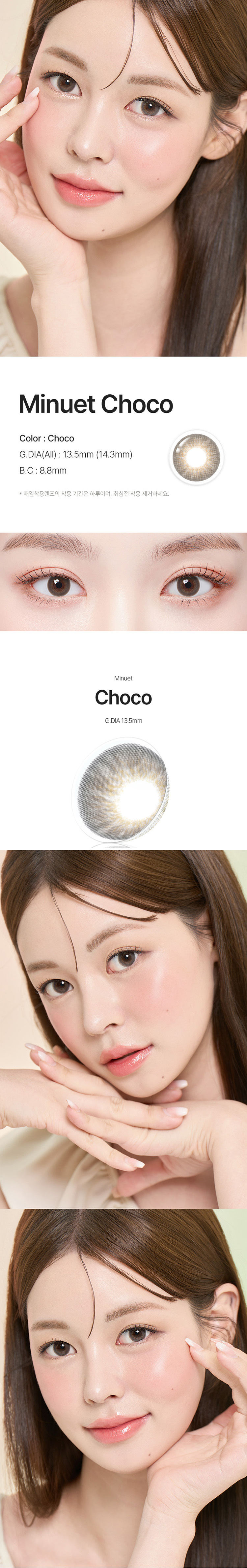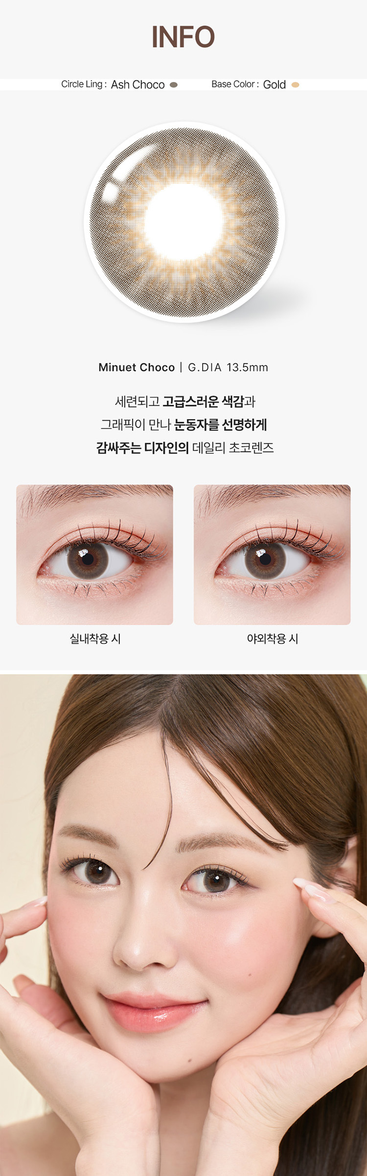 覺得一般棕色隱眼太過沉重或平凡?Minuet Choco 的『精緻巧克力色』為你帶來全新選擇。其輕盈的色調與絲絨光感,能讓眼神看起來優雅又充滿靈氣,特別適合搭配氣質系妝容與穿搭。