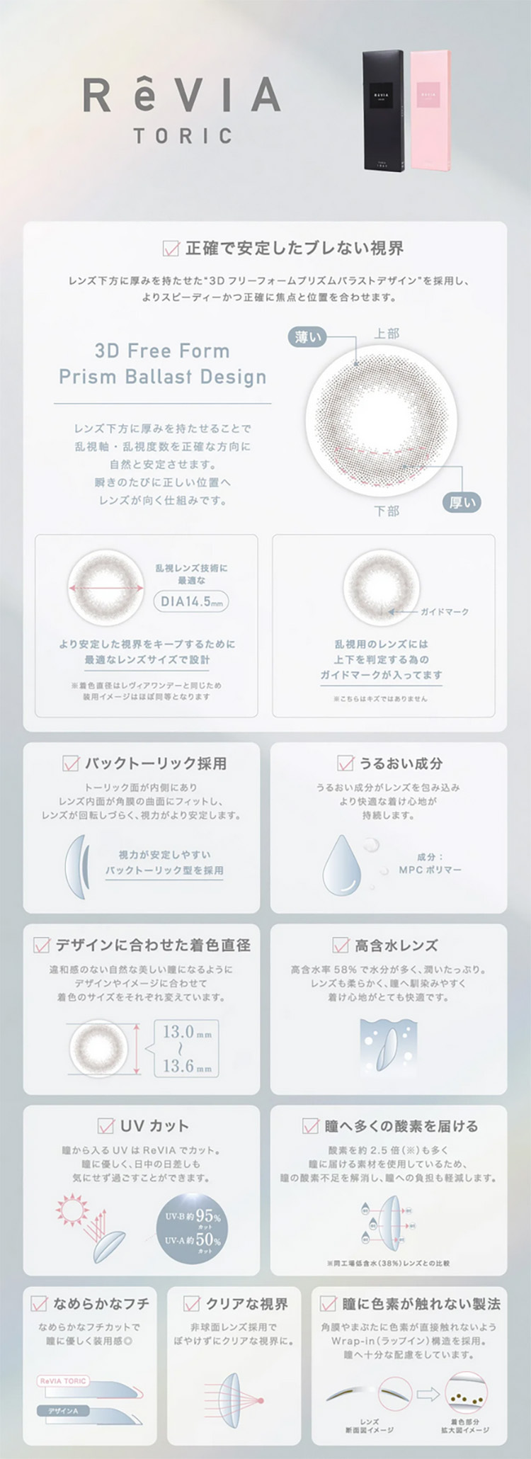 Revia 蕾美 Toric 系列是專為有散光(Astigmatism) 問題的消費者所設計的矯正型彩色隱形眼鏡。它解決了傳統「只有近視度數」的美瞳無法為散光族群提供清晰視覺的痛點,將精準軸度矯正與Revia經典的自然美學設計相結合。