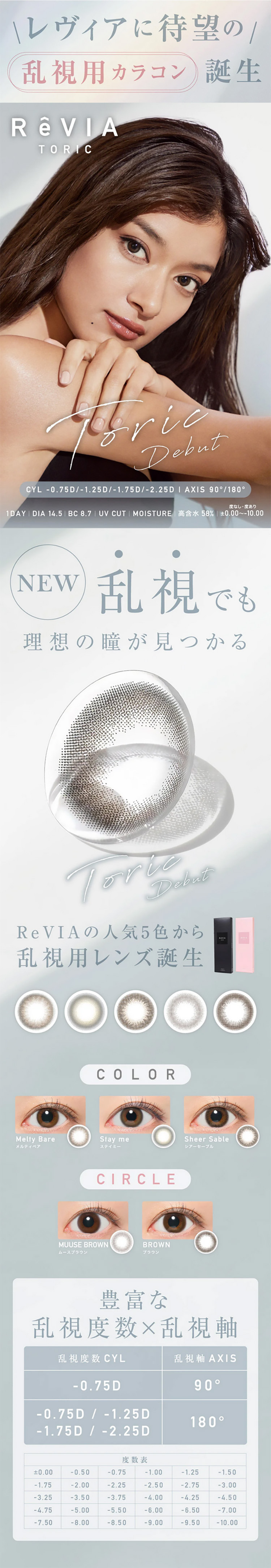 Revia 蕾美 Toric 系列是專為有散光(Astigmatism) 問題的消費者所設計的矯正型彩色隱形眼鏡。它解決了傳統「只有近視度數」的美瞳無法為散光族群提供清晰視覺的痛點,將精準軸度矯正與Revia經典的自然美學設計相結合。